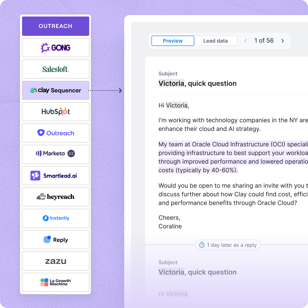 Export directly to email and multi-channel sequencers such as Outreach, Instantly, and HeyReach or use Clay’s sequencer. No disruption, just better outcomes.