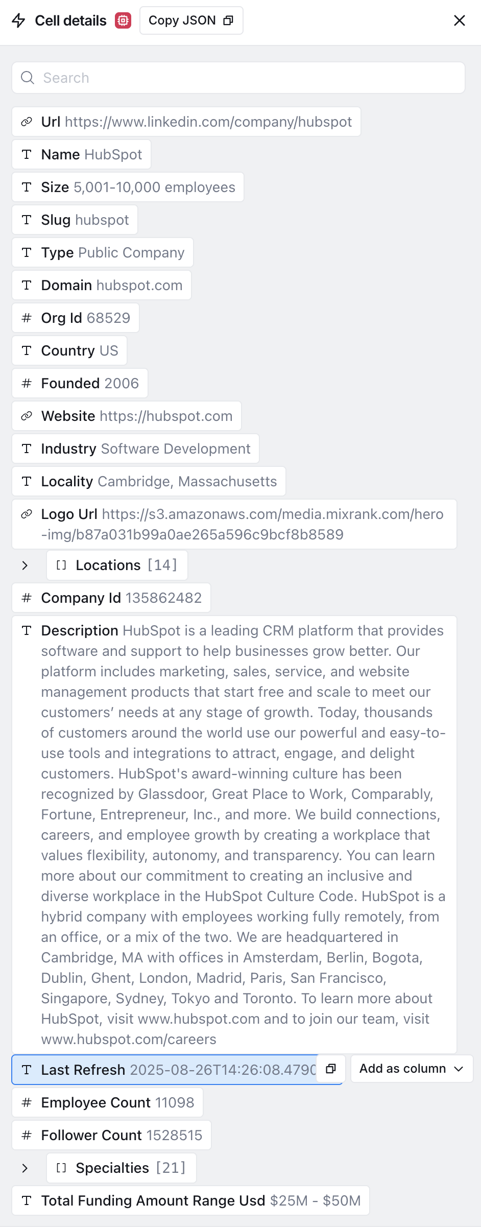 Create a formula column that standardizes the enrichment date to match your CRM's expected format. This ensures clean data integration and proper tracking of refresh cycles.