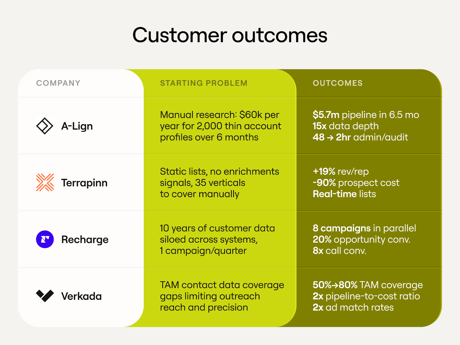 Recharge, the subscription billing platform processing $30 billion annually for 20,000+ merchants, had the opposite problem. They weren’t missing data but had ten years of customer and product data sitting in siloed systems. Clay unified and connected it to campaign execution. One campaign per quarter became eight simultaneous campaigns. Opportunity conversion improved 20%, meeting conversion improved 12%, and call conversion improved 8x. Instead of adding net new data points, Clay made the existing data actionable.