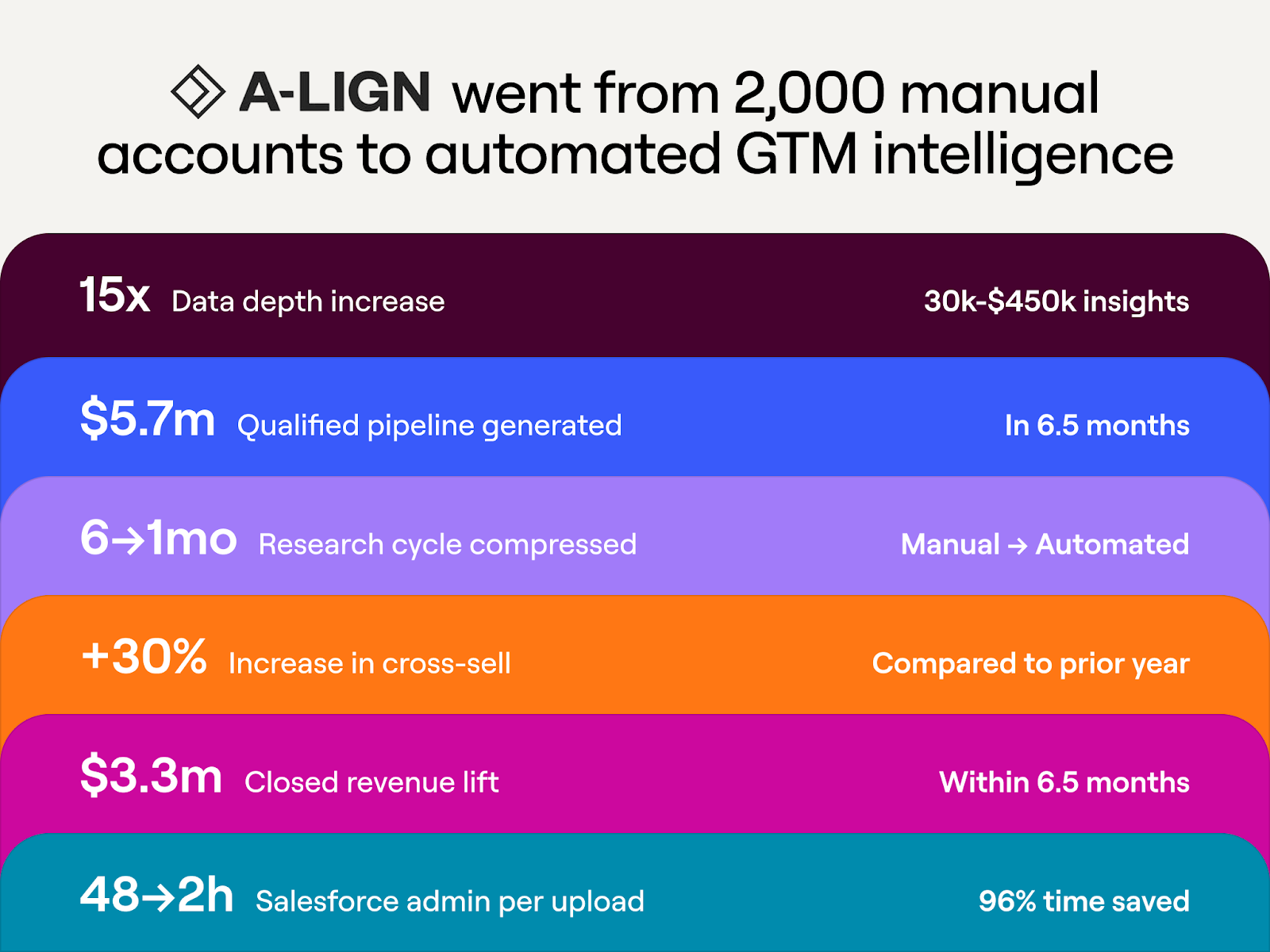 Building automated research workflows on Clay, A-LIGN replaced six months of manual work with one month of automated execution. 30,000 basic data points became 450,000 detailed insights, a 15x increase in data depth at a cost of $50K for the platform, down from $60K for the manual contractor. At the same time, Salesforce admin work dropped from 48 hours to 2 hours per cycle.