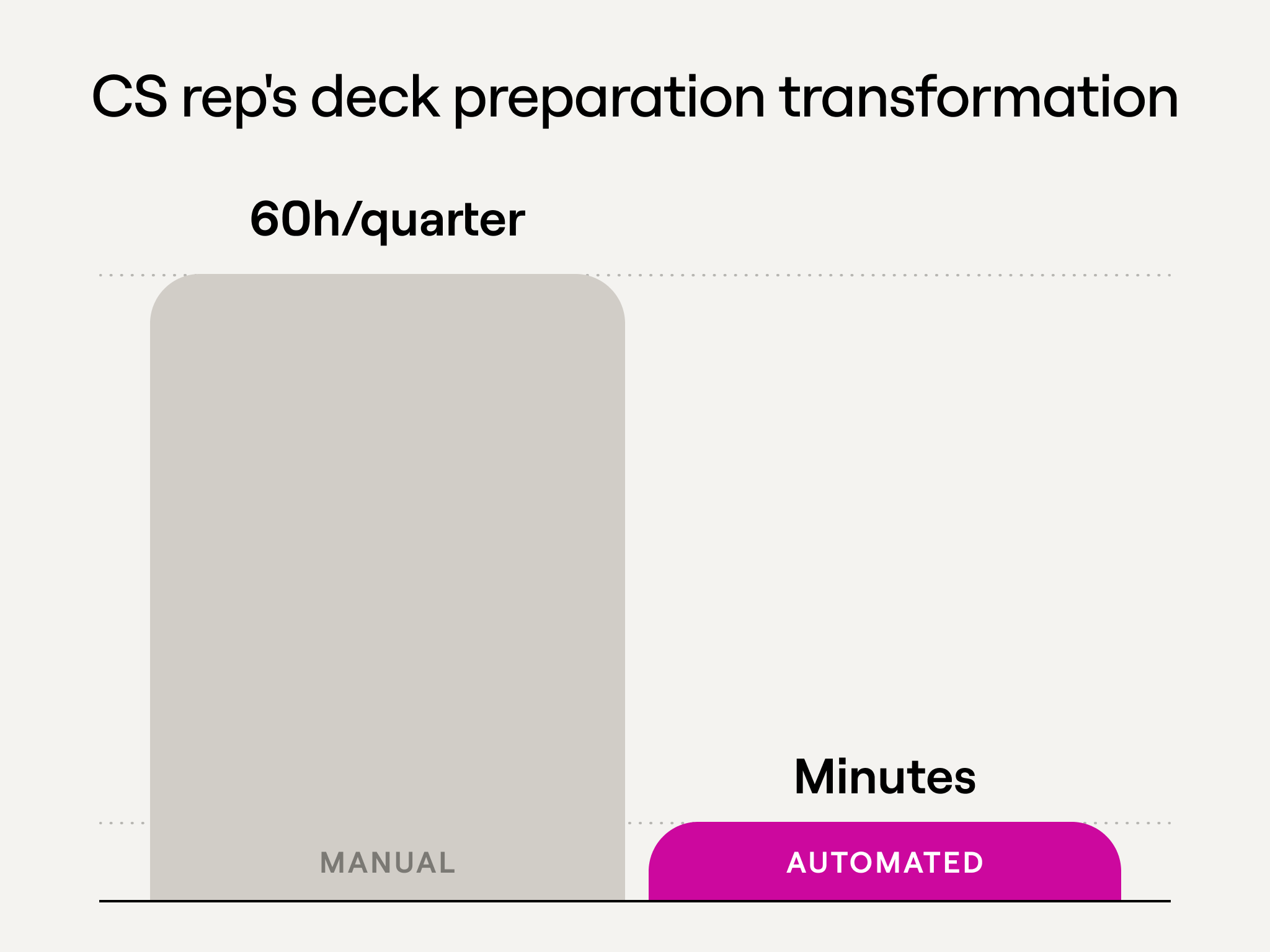 A CS rep earning $300K all-in who spends 60 hours per quarter on manual deck prep is burning ~$23K in labor costs that can be automated away. Those 60 hours get reallocated to actual customer conversations, expansion discussions, and relationship building which drives more revenue per CS rep. Every customer gets consistent, thorough decks instead of prioritization based on team bandwidth.