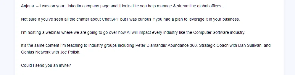 We generally advise against asking for a live meeting, which will likely increase your prospect’s resistance. In some specific cases, when your message conveys high enough value, you can ask someone for time.
