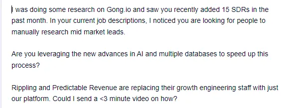 ✉️ I was reading your job description for your open SDR role, and it looks like you have your team manually researching information. We built a tool that automates 90% of your manual research by combining data from over 40 databases. Rippling and Predictable Revenue are replacing their growth engineering staff with just our platform. Could I send a <3 minute video on how?