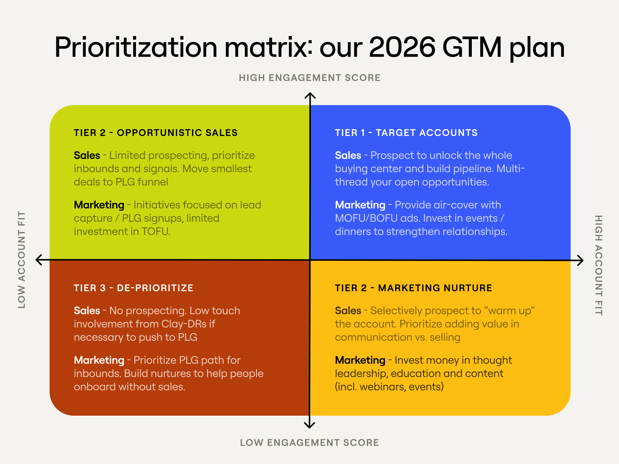 The logic works in two directions. Sales, SDRs, and growth are working to unlock the Tier 1 accounts and, ideally, closing deals. Meanwhile, marketing is seeding the best-fit Tier 2 accounts: running thought leadership, events, and content designed to warm them up so they're no longer freezing cold when H2 starts. The goal is to promote the strongest Tier 2 accounts into Tier 1 the next time around.