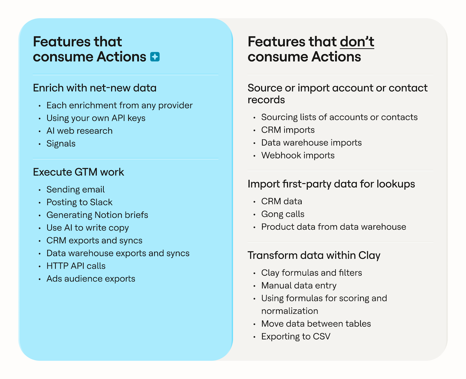 In order to achieve this, we are separating data and platform costs. Credits are now Data Credits, and we’re introducing Actions to measure platform work, so customers have a clearer picture of how they’re using Clay. We've designed plans so 90% of customers will never hit a limit on Actions.