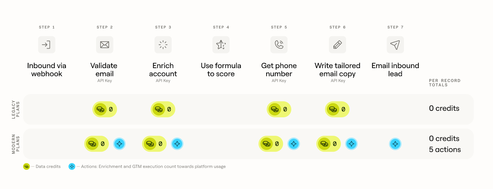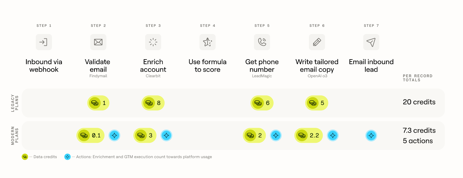 The example workflow below compares the legacy and modern pricing structures. Because data is cheaper under the new model, the same workflow costs 7.3 Data Credits on modern plans, compared to 20 Data Credits on legacy plans. On modern plans, enrichment and GTM execution steps each count as one Action toward the overall platform usage.