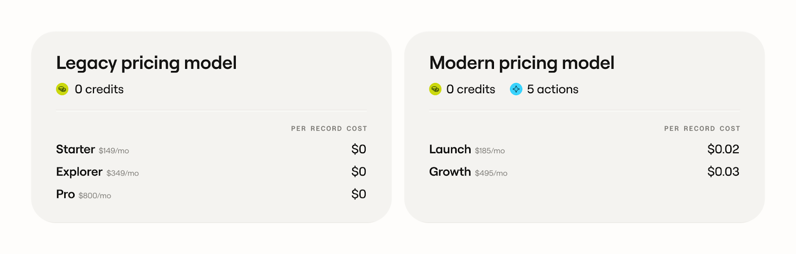 Previously, even though Clay was orchestrating the end-to-end automation of the inbound flow, the workflow was effectively free to the customer. On modern pricing plans, there’s now effectively a very small per-record cost, because Actions now directly tie Clay’s platform value to the customer’s platform cost.