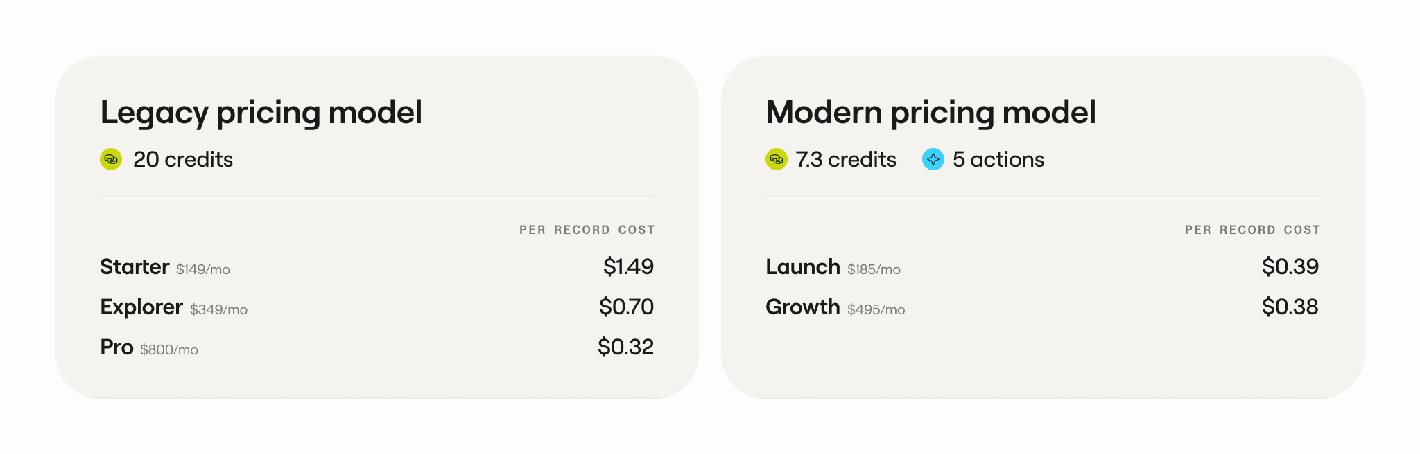 - Know exactly what you're paying for: Pricing now separates data costs (Data Credits) from platform work (Actions), giving you a clearer picture of your spend. Data Credits are more affordable than ever, and 90% of customers will never hit their Actions limit.