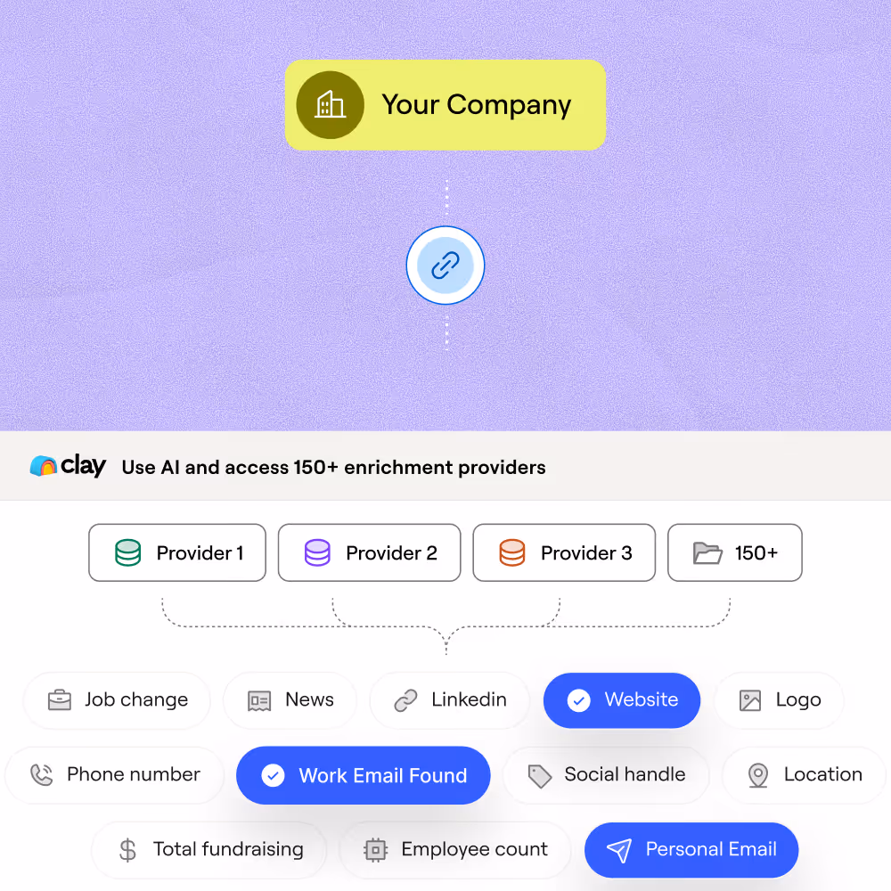 Source and enrich accounts and contacts from Clay’s marketplace of 150+ data providers for the most complete and trustworthy GTM data.