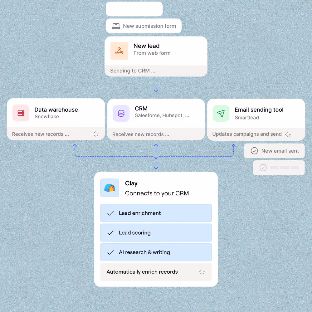 Enrich inbound leads with data like company size, tech stack, job titles and intent signals, synced to your CRM from Clay’s data marketplace and AI research.