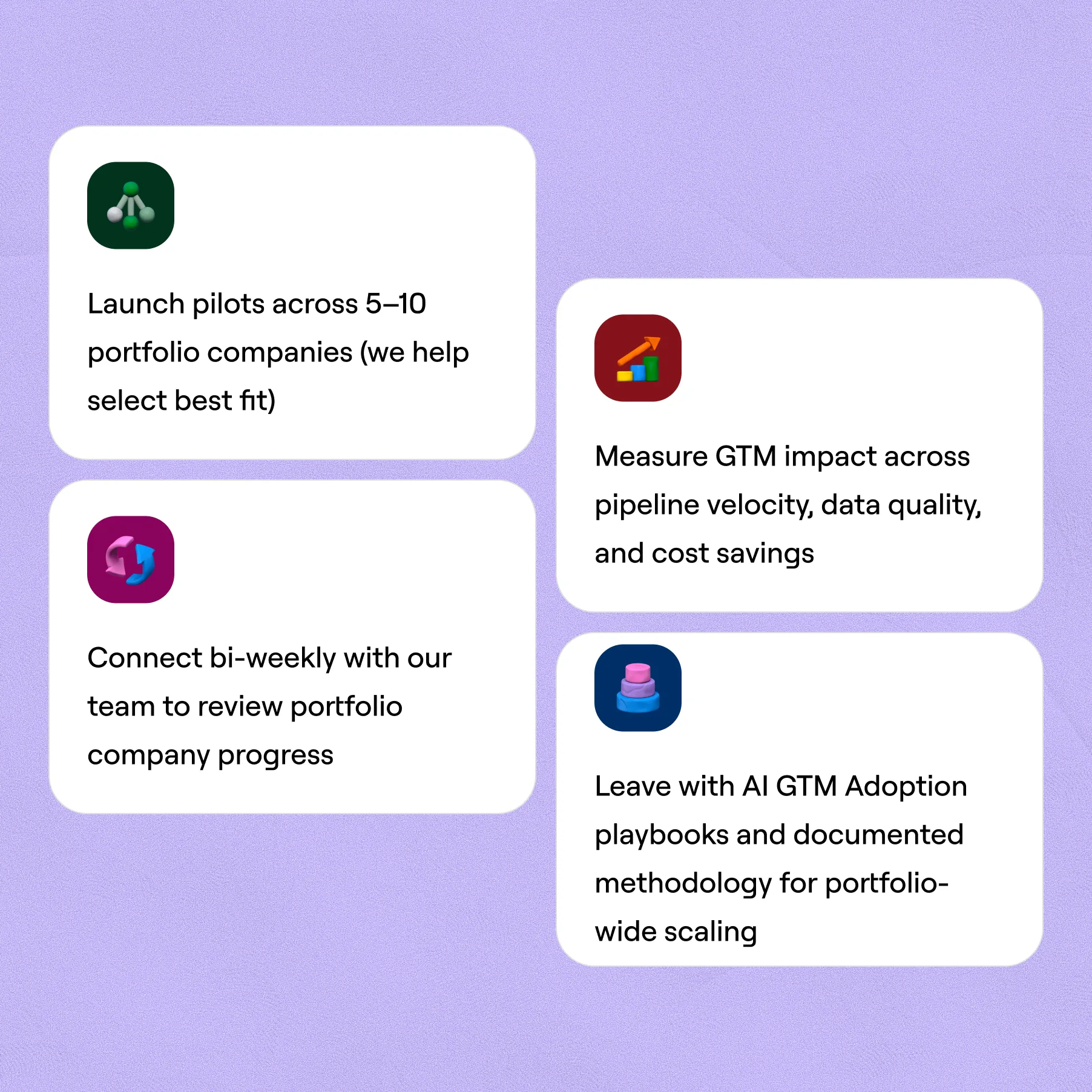 Develop standardized frameworks for measuring and reporting Clay's impact across your portfolio—from pipeline contribution to cost savings to revenue efficiency. We help you package those wins into playbooks with clear ROI that demonstrate growth durability and exit readiness.